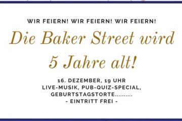 Am 16.12.17 um 19:00 Uhr feiert die Baker Street von PopRat Julian Blomann und seinem Team ihren 5. Geburtstag und dazu gehört eine anständige Party.